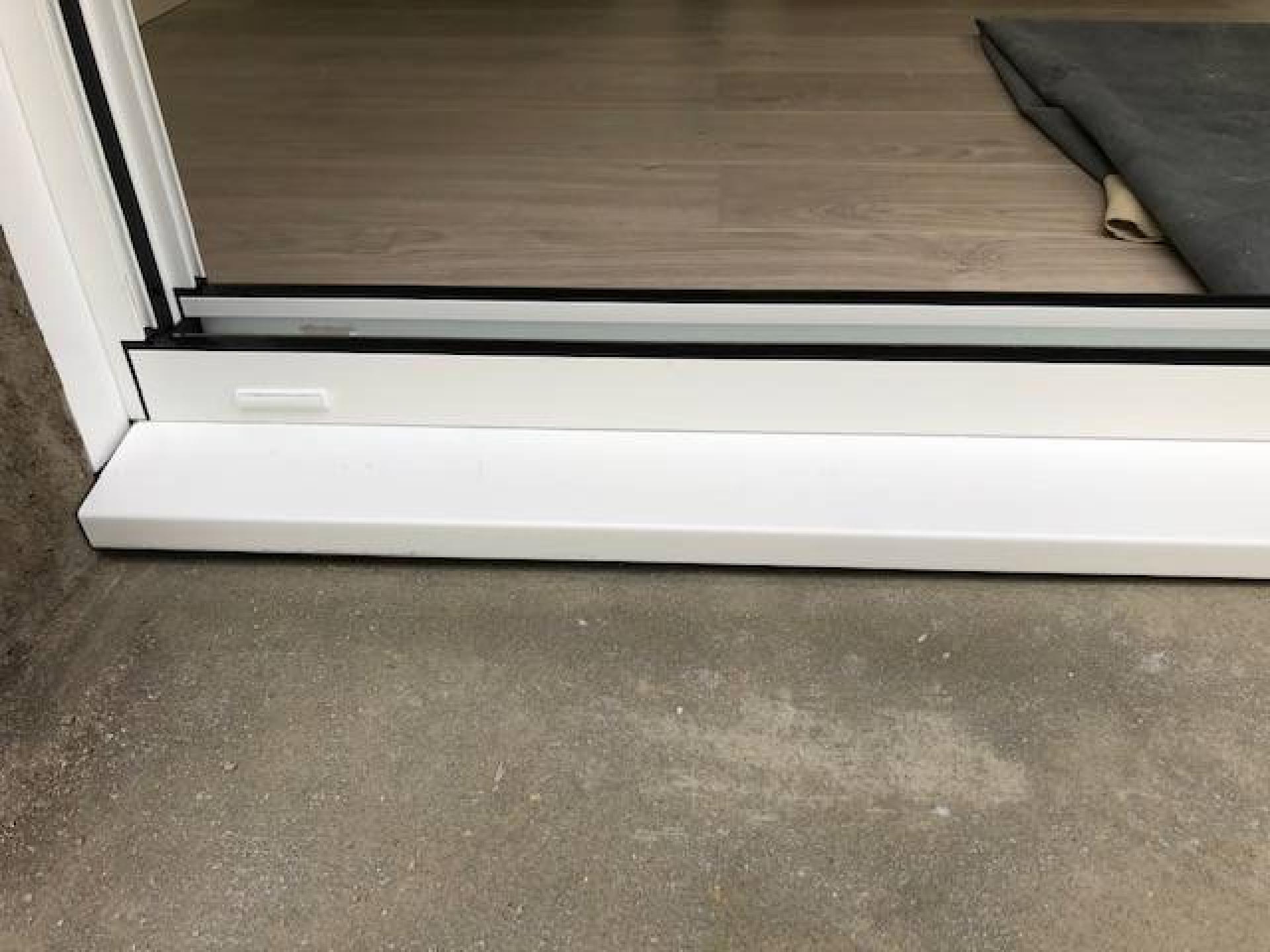 Agrandissement d'une ancienne porte-fenêtre PVC et pose d'un coulissant deux vantaux en Aluminium de marque AMCC gamme Elegance ainsi qu'un volet roulant en motorisation électrique de marque PROFALUX modèle Visio posé en applique au dessus du linteau.